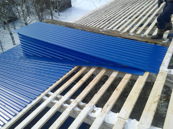 -Кровельный материал. На обрешетку укладываются листы профнастила, которые нахлестывают друг на друга в горизонтальном и вертикальном направлении, чтобы создать герметичное покрытие, и закрепляют кровельными саморезами.