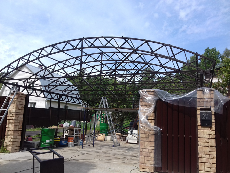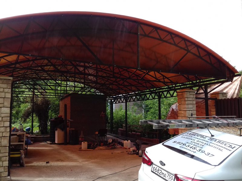 Минималистическая несущая конструкция из прочного металла легко выдерживает полимерное полотно, поэтому навесу для автомобиля не нужно большое количество несущих балок и столбов.