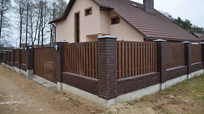 Придать ограждению из евроштакетника более презентабельный вид возможно посредством установки столбов из кирпича для забора. Фото имеющихся в сети вариантов поможет ознакомиться с разновидностями таких ограждающих конструкций.
