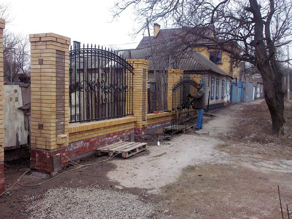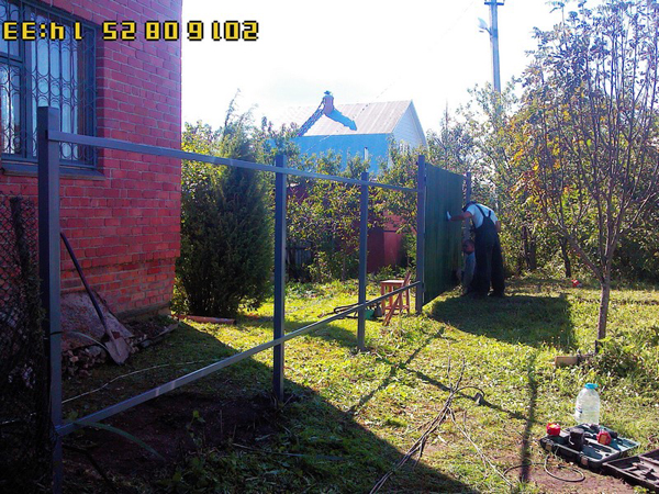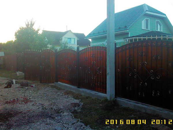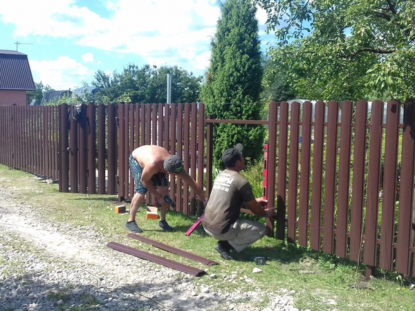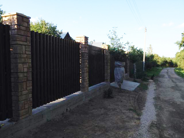 При постройке такого забора сначала устанавливается металлический каркас, который обшивается планками из высококачественной стали, толщиной 0,5 мм.